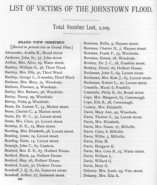 Bowman, Nellie, 9, Haynes street. Bowman, Charles H., 7, Haynes street. Bowman, Frank P., 33, Woodvale. Bowman, Emma, 28, Woodvale. Brinkey, Dr. J. C., 28, Franklin street. Brinkey, Elmer, 26, Hulbert House. Buchanan, John S., 69, Locust street. Buchanan, Mrs. Kate J., 63, Locust street. Buchanan, Robert L, 20, Locust street. Connelly, Maud, 6, Franklin. Constable, Philip E., 60, Broad street. Cope, Mrs. Margaret, 65, Conemaugh. Cope, Ella B., 28, Conemaugh. Cooney, Mrs. Elizabeth. Davis, Mary Ann, 40, Woodvale. Davis, Thomas S., 59, Locust street. Davis, Mrs. Elizabeth. Davis, Mrs. Susan, 27, Millville. Davis, Clara, 8, Millville. Davis, Willie, 3, Millville. Davis, Eliza M. Davis, Margaret E. Davis, Mrs. Cora B., 25, Water street. Davis, William L. Davis, Willard G. Davis, Mary G. Delaney, Mrs. Jessie, 29, Vine street. Delaney, Mrs. Ella A. |