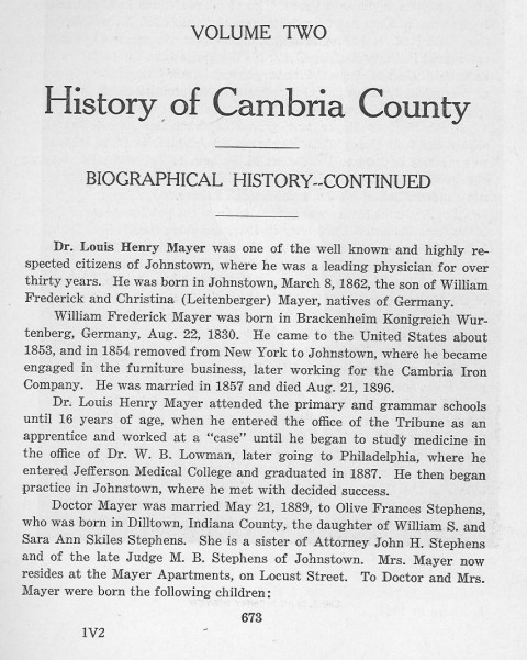 Doctor Mayer was married May 21, 1889, to Olive Frances Stephens, who was born in Dilltown, Indiana County, the daughter of William S. and Sara Ann Skiles Stephens. She is a sister of Attorney John H. Stephens and of the late Judge M. B. Stephens of Johnstown. Mrs. Mayer now resides at the Mayer Apartments, on Locust Street. To Doctor and Mrs. Mayer were born the following children:
