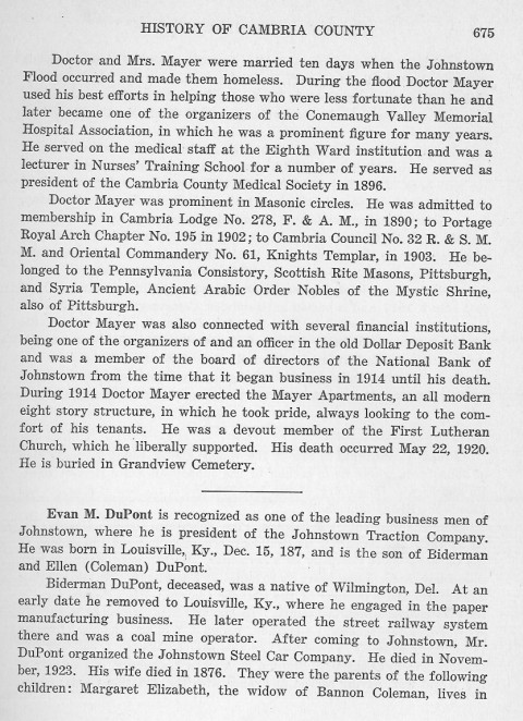 Doctor and Mrs. Mayer were married ten days when the Johnstown Flood occurred and made them homeless. During the flood Doctor Mayer used his best efforts in helping those who were less fortunate than he and later became one of the organizers of the Conemaugh Valley Memorial Hospital Association, in which he was a prominent figure for many years. He served on the medical staff at the Eighth Ward institution and was a lecturer in Nurses' Training School for a number of years. He served as president of the Cambria County Medical Society in 1896. Evan M. DuPont is recognized as one of the leading business men of Johnstown, where he is president of the Johnstown Traction Company. He was born in Louisville, Ky., Dec. 15, 187, and is the son of Biderman and Ellen (Coleman) DuPont. Biderman DuPont, decreased, was a native of Wilmington, Del. At an early date he removed to Louisville, Ky., where he engaged in the paper manufacturing business. He later operated the street railway system there and was a coal mine operator. After coming to Johnstown, Mr. DePont organized the Johnstown Steel Car Company. He died in November, 1923. His wife died in 1876. They were the parents of the following children: Margaret Elizabeth, the widow of Bannon Coleman, lives in |