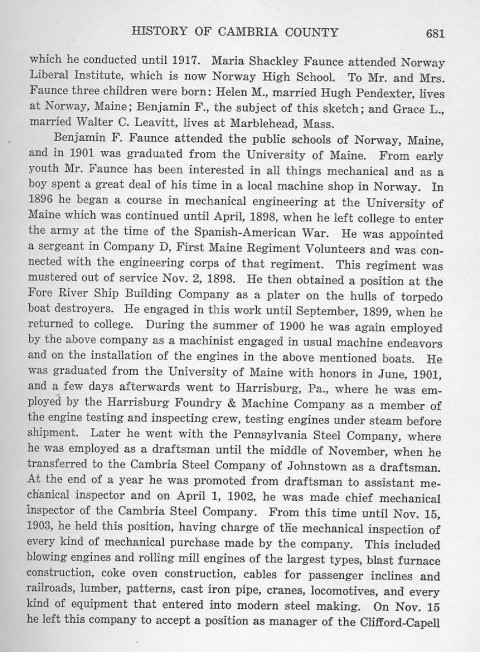 Benjamin F. Faunce attended the public schools of Norway, Maine, and in 1901 was graduated from the University of Maine. From early youth Mr. Faunce has been interested in all things mechanical and as a boy spent a great deal of his time in a local machine ship in Norway. In 1896 he began a course in mechanical engineering at the University of Maine which was continued until April, 1898, when he left college to enter the army at the time of the Spanish-American War. He waz appointed a sergeant in Company D, First Maine Regiment Volunteers and was connected with the engineering corps of that regiment. This regiment was mustered out of service Nov. 2, 1898. He then obtained a position at the Fore River Ship Building Company as a plater on the hulls of torpedo boat destroyers. He was engaged in this work until September, 1899, when he returned to college. During the summer of 1900 he was again employed by the above company as a machinist engaged in usual machine endeavors and on the installation of the engines in the above mentioned boats. He was graduated from the University of Maine with honors in June, 1901, and a few days afterwards went to Harrisburg, Pa., where he was employed by the Harrisburg Foundry & Machine Company as a member of the engine testing and inspecting crew, testing engines under steam before shipment. Later he went with the Pennsylvania Steel Company, where he was employed as a draftsman until the middle of November when he transferred to the Cambria Steel Company of Johnstown as a draftsman. At the end of a year he was promoted from draftsman to assistant mechanical inspector and on April 1, 1902, he was made chief mechanical inspector of the Cambria Steel Company. From this time until Nov. 15, 1903, he held this position, having charge of the mechanical inspection of every kind of mechanical purchase made by the company. This included blowing engines and rolling mill engines of the largest types, blast furnace reconstruction, coke oven construction, cables for passenger inclines and railroads, lumber, patterns, cast iron pipe, cranes, locomotives, and every kind of equipment that entered into modern steel making. On Nov. 15, he left this company to accept a position as manager of the Clifford-Capell