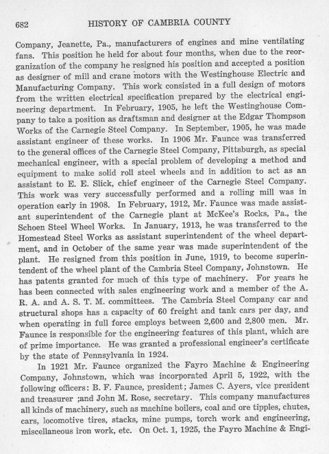 Company, Jeanette, Pa., manufacturers of engines and mine ventilating fans. This position he held for about four months, when due to the reorganization of the company he resigned his position and accepted a position as designer of mill and crane motors with the Westinghouse Electric and Manufacturing Company. This work consisted in a full design of motors from the written electrical specification prepared by the electrical engineering department. In February, 1905, he left the Westinghouse Company to take a position as draftsman and designer at the Edgar Thomson Works of the Carnegie Steel Company. In September, 1905, he was made assistant engineer of these works. In 1906 Mr. Faunce was transferred to the general office of the Carnegie Steel Company, Pittsburgh, as special mechanical engineer, with a special problem of developing a method and equipment to make solid roll steel wheels and in addition to act as an assistant to E. E. Slick, chief engineer of the Carnegie Steel Company. This work was very successfully performed and a rolling mill was in operation early in 1908. In February, 1912, Mr. Faunce was made assistant superintendent of the Carnegie plant at McKee's Rocks, Pa., the Schoen Steel Wheel Works. In January, 1913, he was transferred to the Homestead Steel Works as assistant superintendent of the wheel department, and in October of the same year was made superintendent of the plant. He resigned from this position in June, 1919, to become superintendent of the wheel plant of the Cambria Steel Company, Johnstown. He has patents granted for much of this type of machinery. For years he has been connected with sales engineering work and a member of the A. R. A. and A. S. T. M. committees. The Cambria Steel Company car and structural shops has a capacity of 60 freight and tank cars per day, and when operating in full force employs between 2,600 and 2,800 men. Mr. Faunce is responsible for the engineering features of this plant, which are of prime importance. He was granted a professional engineer's certificate by the state of Pennsylvania in 1924.