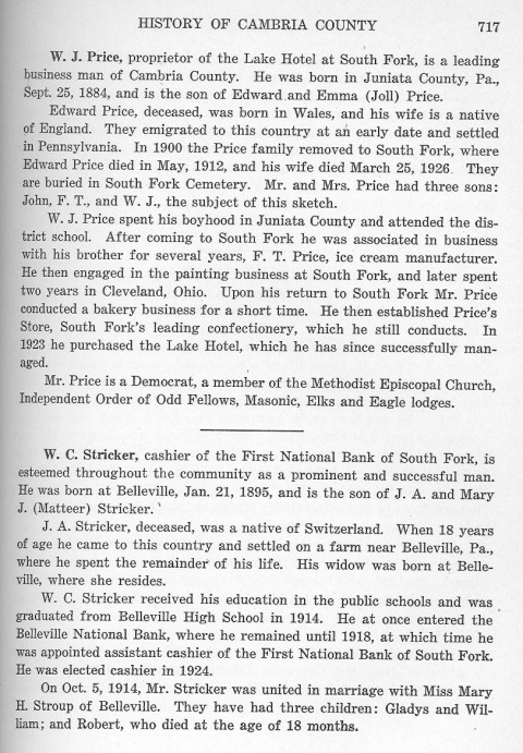 W. J. Price, proprietor of the Lake Hotel at South Fork, is a leading business man of Cambria County. He was born in Juniata County, Pa., Sept. 25, 1884, and is the son of Edward and Emma (Joll) Price. W. C. Stricker, cashier of the First National Bank of South Fork, is esteemed throughout the community as a prominent and successful man. He was born at Belleville, Jan. 21, 1895, and is the son of J. A. and Mary J. (Matteer) Stricker. J. A. Stricker, deceased, was a native of Switzerland. When 18 years of age he came to this country and settled on a farm near Belleville, Pa.; where he spent the remainder of his life. His widow was born at Belleville, where she resides. W. C. Stricker received his education in the public schools and was graduated from Belleville High School in 1914. He at once entered the Belleville National Bank, where he remained until 1918, at which time he was appointed assistant cashier of the First National Bank of South Fork. He was elected cashier in 1924. On Oct. 5, 1914, Mr. Stricker was united in marriage with Miss Mary H. Stroup of Belleville. They have had three children: Gladys and William; and Robert, who died at the age of 18 months. |