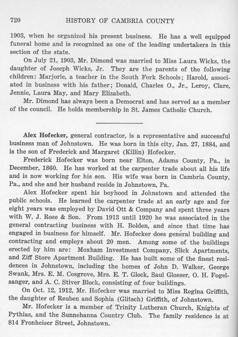 1903, when he organized his present business. He has a well equipped funeral home and is recognized as one of the leading undertakers in this section of the state. Alex Hofecker, general contractor, is a representative and successful business man of Johnstown. He was born in this city, Jan. 27, 1884, and is the son of Frederick and Margaret (Killin) Hofecker. Frederick Hofecker was born near Elton, Adams County, Pa., in December, 1860. He has worked at the carpenter trade about all his life and is now working for his son. His wife was born in Cambria County, Pa., and she and her husband reside in Johnstown, Pa. Alex Hofecker spent his boyhood in Johnstown and attended the public schools. He learned the carpenter trade at an early age and for eight years was employed by David Ott & Company and spent three years with W. J. Rose & Son. From 1913 until 1920 he was associated in the general contracting business with H. Bolden, and since that time has engaged in business for himself. Mr. Hofecker does general building and contracting and employs about 20 men. Among some of the buildings erected by him are: Moxham Investment Company, Slick Apartments, and Ziff Store Apartment Building. He has built some of the finest residences in Johnstown, including the homes of John D. Walker, George Swank, Mrs. E. M. Cosgrove, Mr. E. T. Glock, Saul Glosser, O. H. Fogelsanger and A. C. Stiver Block, consisting of four buildings. On Oct. 12, 1912, Mr. Hofecker was married to Miss Regina Griffith, the daughter of Reuben and Sophia (Glitsch) Griffith, of Johnstown. Mr. Hofecker is a member of Trinity Lutheran Church, Knights of Pythias, and the Sunnehanna Country Club. The family residence is at 814 Fronheiser Street, Johnstown. |