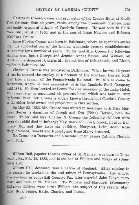 Charles N. Crouse, owner and proprietor of the Crouse Hotel at South Fork for more than 40 years, ranks among the prominent business men and highly esteemed citizens of Cambria County. He was born in Baltimore, Md., April 7, 1856, and is the son of Isaac Newton and Rebecca (Callison) Crouse.