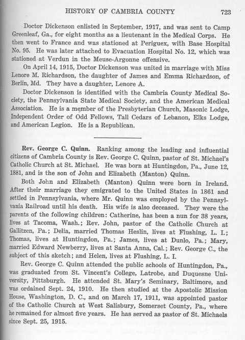 Doctor Dickenson enlisted in September, 1917, and was sent to Camp Greenleaf, Ga., for eight months as a lieutenant in the Medical Corps. He then went to France and was stationed at Periguex, with Base Hospital No. 95. He was later attached to Evacuation Hospital No. 12, which was stationed at Verdun in the Meuse-Argonne offensive. Rev. George C. Quinn. Ranking among the leading and influential citizens of Cambria County is Rev. George C. Quinn, pastor of St. Michael's Catholic Church at St. Michael. He was born at Huntingdon, Pa., June 12, 1881, and is the son of John and Elizabeth (Manton) Quinn. Both John and Elizabeth (Manton) Quinn were born in Ireland. After their marriage they emigrated to the United States in 1861 and settled in Pennsylvania, where Mr. Quinn was employed by the Pennsylvania Railroad until his death. His wife is also deceased. They were the parents of the following children: Catherine, has been a nun for 38 years, lives at Tacoma, Wash.; Rev. John, pastor of the Catholic Church at Gallitzen, Pa.; Delia, married Thomas Heslin, lives at Flushing, L. I.; Thomas, lives at Huntingdon, Pa.; James, lives at Dunlo, Pa.; Mary, married Edward Newberry, lives at Santa Anna, Cal.; Rev. George C., the subject of this sketch; and Helen, lives at Flushing, L. I. Rev. George C. Quinn attended the public schools of Huntingdon, Pa., was graduated from St. Vincent's College, Latrobe, and Duquesne University, Pittsburgh. He attended St. Mary's Seminary, Baltimore, and was ordained Sept. 24, 1910. He then studied at the Apostolic Mission House, Washington, D. C., and on March 17, 1911, was appointed pastor of the Catholic Church at West Salisbury, Somerset County, Pa., where he remained for almost five years. He has served as pastor of St. Michaels since Sept. 25, 1915. |