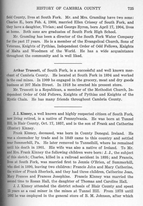field County, lives at South Fork. Mr. and Mrs. Gramling have two sons: Charles E., born Feb. 4, 1900, married Ellen Crissey of South Fork, and they have a daughter, Vivian; and George Byron, born April 17, 1904, lives at home. Both sons are graduates of South Fork High School. Mr. Truscott, of South Fork, is a successful and well known merchant of Cambria County. He located at South Fork in 1894 and worked in the coal mines. In 1909 he engaged in the grocery, meat and dry goods business at 207 Main Street. In 1918 he erected his present store. Mr. Truscott is a Republican, a member of the Methodist Church, Independent Order of Odd Fellows, Knights of Pythias and Knights of the Mystic Chain. He has many friends throughout Cambria County. J. J. Kinney, a well known and highly respected citizen of South Fork, now living retired, is a native of Pennsylvania. He was born at Tunnel Hill, in Blair County, Oct. 17, 1857, and is the son of Frank and Catherine (Hunter) Kinney. Frank Kinney, deceased, was born in County Donegal, Ireland. He was a shoemaker by trade and in 1849 came to this country and settled near Summerhill, Pa. He later removed to Tunnelhill, where he remained until his death in 1901. His wife was also a native of Ireland. To Mr. and Mrs. Frank Kinney the following children were born: J. J., the subject of this sketch; Charles, killed in a railroad accident in 1895; and Francis, lives at South Fork, was married first to Jennie O'Brien, of Summerhill, who died in 1890, leaving two children: Francis John and Mary Catherine, the widow of Frank Sherlock, and they had three children, Catherine Jean, Mary Frances and Frances Josephine. Francis Kinney was married the second time to Rosan Hall, the daughter of Thomas and Caroline Hall. J. J. Kinney attended the district schools of Blair County and spent 13 years as a coal miner in the mines at Tunnel Hill. From 1878 until 1892 he was employed in the general store of B. M. Johnson, after which |