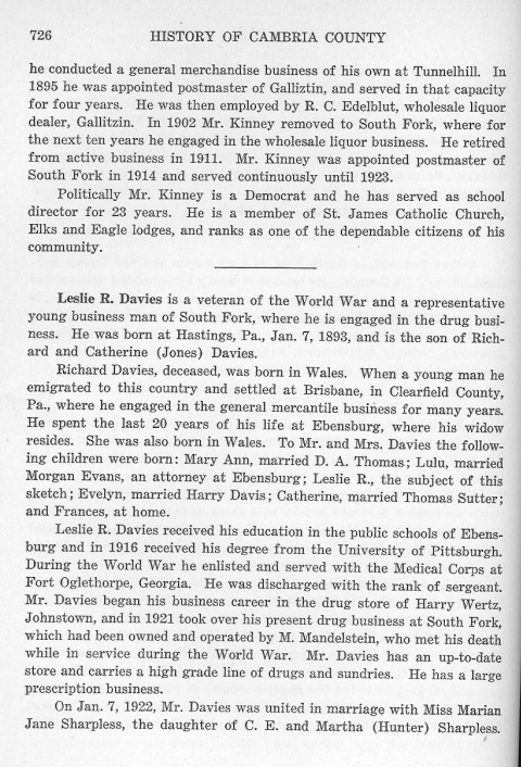 he conducted a general merchandise business of his own at Tunnelhill. In 1895 he was appointed postmaster of Galliztin, and served in that capacity for four years. He was then employed by R. C. Edelblut, wholesale liquor dealer, Gallitzin. In 1902 Mr. Kinney removed to South Fork, where for the next ten years he engaged in the wholesale liquor business. He retired from active business in 1911. Mr. Kinney was appointed postmaster of South Fork in 1914 and served continuously until 1923. Leslie R. Davies is a veteran of the World War and a representative young business man of South Fork, where he is engaged in the drug business. He was born at Hastings, Pa., Jan. 7, 1893, and is the son of Richard and Catherine (Jones) Davies. Richard Davies, deceased, was born in Wales. When a young man he emigrated to this country and settled at Brisbane, in Clearfield County, Pa., where he engaged in the general mercantile business for many years. He spent the last 20 years of his life at Ebensburg, where his widow resides. She was also born in Wales. To Mr. and Mrs. Davies the following children were born: Mary Ann, married D. A. Thomas; Lulu, married Morgan Evans, an attorney at Ebensburg; Leslie R., the subject of this sketch; Evelyn, married Harry Davis; Catherine, married Thomas Sutter; and Frances, at home. Leslie R. Davies received his education in the public schools of Ebensburg and in 1916 received his degree from the University of Pittsburgh. During the World War he enlisted and served with the Medical Corps at Fort Oglethorpe, Georgia. He was discharged with the rank of sergeant. Mr. Davies began his business career in the drug store of Harry Wertz, Johnstown, and in 1921 took over his present drug business at South Fork, which had been owned and operated by M. Mandelstein, who met his death while in service during the World War. Mr. Davies has an up-to-date store and carries a high grade line of drugs and sundries. He has a large prescription business. On Jan. 7, 1922, Mr. Davies was united in marriage with Miss Marian Jane Sharpless, the daughter of C. E. and Martha (Hunter) Sharpless. |