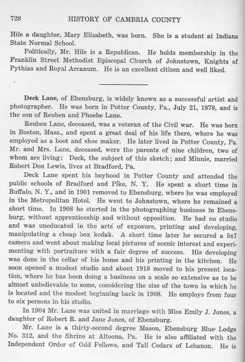 Hile a daughter, Mary Elizabeth, was born. She is a student at Indiana State Normal School. Deck Lane, of Ebensburg, is widely known as a successful artist and photographer. He was born in Potter County, Pa., July 21, 1878, and is the son of Reuben and Phoebe Lane. Reuben Lane, deceased, was a veteran of the Civil war. He was born in Boston, Mass., and spent a great deal of his life there, where he was employed as a boot and shoe maker. He later lived in Potter County, Pa. Mr. and Mrs. Lane, deceased, were the parents of nine children, two of whom are living: Deck, the subject of this sketch; and Minnie, married Robert Don Lewis, lives at Bradford, Pa. Deck Lane spent his boyhood in Potter County and attended the public schools of Bradford and Pike, N. Y. He spent a short time in Buffalo, N. Y., and in 1901 removed to Ebensburg, where he was employed in the Metropolitan Hotel. He went to Johnstown, where he remained a short time. In 1908 he started in the photographing business in Ebensburg, without apprenticeship and without opposition. He had no studio and was uneducated in the arts of exposure, printing and developing, manipulating a cheap box kodak. A short time later he secured a 5x7 camera and went about making local pictures of scenic interest and experimenting with portraiture with a fair degree of success. His developing was done in the cellar of his home and his printing in the kitchen. He soon opened a modest studio and about 1918 moved to his present location, where he has been doing a business on a scale so extensive as to be almost unbelievable to some, considering the size of the town in which he is located and the modest beginning back in 1908. He employs from four to six persons in his studio. In 1904 Mr. Lane was united in marriage with Miss Emily J. Jones, a daughter of Robert R. and Jane Jones, of Ebensburg. Mr. Lane is a thirty-second degree Mason, Ebensburg Blue Lodge No. 312, and the Shrine at Altoona, Pa. He is also affiliated with the Independent Order of Odd Fellows, and Tall Cedars of Lebanon. He is |