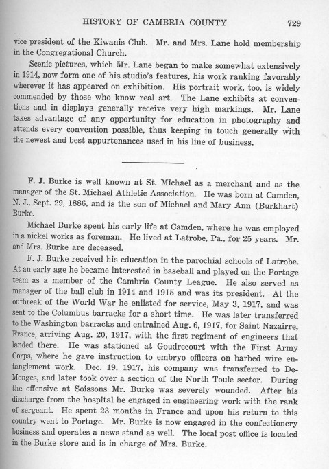 vice president of the Kiwanis Club. Mr. and Mrs. Lane hold membership in the Congregational Church. F. J. Burke is well known at St. Michael as a merchant and as the manager of the St. Michael Athletic Association. He was born at Camden, N. J., Sept. 29, 1886, and is the son of Michael and Mary Ann (Burkhart) Burke. Michael Burke spent his early life at Camden, where he was employed in a nickel works as foreman. He lived at Latrobe, Pa., for 25 years. Mr. and Mrs. Burke are deceased. F. J. Burke received his education in the parochial schools of Latrobe. At an early age he became interested in baseball and played on the Portage team as a member of the Cambria County League. He also served as manager of the ball club in 1914 and 1915 and was its president. At the outbreak of the World War he enlisted for service, May 3, 1917, and was sent to the Columbus barracks for a short time. He was later transferred to the Washington barracks and entrained Aug. 6, 1917, for St. Nazairre, France, arriving Aug. 20, 1917, with the first regiment of engineers that landed there. He was stationed at Goudrecourt with the First Army Corps, where he gave instruction to embryo officers on barbed wire entanglement work. Dec. 19, 1917, his company was transferred to DeMonges, and later took over a section of the North Toule sector. During the offensive at Soissons Mr. Burke was severely wounded. After his discharge from the hospital he engaged in engineering work with the rank of sergeant. He spent 23 months in France and upon his return to this country went to Portage. Mr. Burke is now engaged in the confectionery business and operates a news stand as well. The local post office is located in the Burke store and is in charge of Mrs. Burke. |