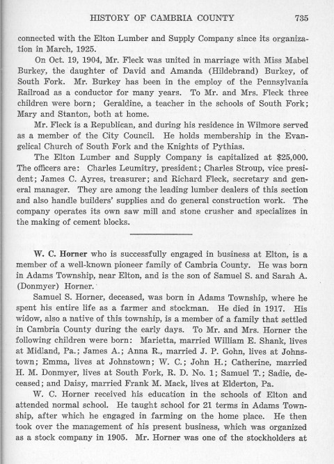 connected with the Elton Lumber and Supply Company since its organization in March, 1925. W. C. Horner who is successfully engaged in business at Elton, is a member of a well-known pioneer family of Cambria County. He was born in Adams Township, near Elton, and is the son of Samuel S. and Sarah A. (Donmyer) Horner. Samuel S. Horner, deceased, was born in Adams Township, where he spent his entire life as a farmer and stockman. He died in 1917. His widow, also a native of this township, is a membe4r of a family that settled in Cambria County during the early days. To Mr. and Mrs. Horner the following children were born: Marietta, married William E. Shank, lives at Midland, pa.; James A.; Anna R., married J. P. Gohn, lives at Johnstown; Emma, lives at Johnstown; W. C.; John H.; Catherine, married H. M. Donmyer, lives at South Fork, R. D. No. 1; Samuel T.; Sadie, deceased; and Daisy, married Frank M. Mack, lives at Elderton, Pa. W. C. Horner received his education in the schools of Elton and attended normal school. He taught school for 21 terms in Adams Township, after which he engaged in farming on the home place. He then took over the management of his present business, which was organized as a stock company in 1905. Mr. Horner was one of the stockholders at |