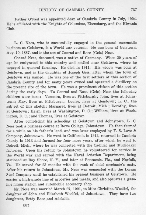 Father O'Neil was appointed dean of Cambria County in July, 1924. He is affiliated with the Knights of Columbus, Ebensburg, and the Kiwanis Club. L. C. Nees, who is successfully engaged in the general mercantile business at Geistown, is a World war veteran. He was born at Geistown, Aug. 10, 1887, and is the son of Conrad and Rose (Geis) Nees. Conrad Nees, deceased, was a native of Germany. When 20 years of age he emigrated to this country and settled near Geistown, where he engaged in general farming. He died in 1911. His widow was born at Geistown, and is the daughter of Joseph Geis, after whom the town of Geistown was named. He was one of the first settlers of this section of Cambria County and for many years owned and operated a distillery on the present site of the town. He was a prominent citizen of this section during the early days. To Conrad and Rose (Geis) Nees the following children were born: Veronica, lives at Pittsburgh; John, lives at Johnstown; May, lives at Pittsburgh; Louise, lives at Geistown; L. C., the subject of this sketch; Margaret, lives at Detroit, Mich.; Dorothy, lives at Geistown; Helen, lives at Washington, D. C.; William, lives at Washington, D. C.; and Thomas, lives at Geistown. After completing his schooling at Geistown and Johnstown, L. C. Nees took a business course at Rowe College, Johnstown. He then farmed for a while on his father's land, and was later employed by F. S. Love & Company, Johnstown. He went to California in 1912, returned to Cambria County in 1913 and farmed for four more years, after which he went to Detroit, Mich., where he was connected with the Cadillac and Studebaker [sic] factories. Upon his return to Johnstown he volunteered for service in the World war and served with the Naval Aviation Department, being stationed at Bay Shore, N. Y., and later at Pensacola, Fla., and Norfolk, Va. He served for 23 months with the rank of chief mechanic's mate. After his return to Johnstown, Mr. Nees was connected with the Lorain Steel Company until he established his present business at Geistown. He carries a high-grade line of groceries and meats, and also operates a gasoline filling station and automobile accessory shop. Mr. Nees was married March 27, 1921, to Miss Christina Woelfel, the daughter of John and Elizabeth Woelfel, of Johnstown. They have tow daughters, Betty Rose and Adelaide. |