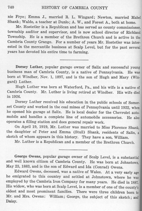 nie Frye; Emma J., married R. L. Wingard; Newton, married Mabel Shank; Waldo, a teacher at Dunlo; A. W., and Forest A., both at home. Dorsey Luther, popular garage owner of Salix and successful young business man of Cambria County, is a native of Pennsylvania. He was born at Windber, Nov. 1, 1897, and is the son of Hugh and Mary (Wingard) Luther. Hugh Luther was born at Waterford, Pa., and his wife is a native of Cambria County. Mr. Luther is living retired at Windber. His wife died in 1926. Dorsey Luther received his education in the public schools of Somerset County and worked in the coal mines of Pennsylvania until 1922, when he opened his garage at Salix. He is local dealer for the Chevrolet automobile and handles a complete line of automobile accessories. He also operates a filling station and does general repair work. On April 19, 1919, Mr. Luther was married to Miss Florence Shank, the daughter of Peter and Emma (Stull) Shank, residents of Salix, a sketch of whom appears in this history. They have a son, William. Mr. Luther is a Republican and a member of the Brethren Church. George Owens, popular garage owner of Scalp Level, is a substantial and well known citizen of Cambria County. He was born at Johnstown, May 23, 1883, and is the son of Edward and Ida (Conrad) Owens. Edward Owens, deceased, was a native of Wales. At a very early age he emigrated to this country and settled at Johnstown, where he was employed by the Cambria Iron Company for many years. He died in 1887. His widow, who was born at Scalp Level, is a member of one of the county's oldest and most prominent families. There were three children born to Mr. and Mrs. Owens: William; George, the subject of this sketch; and Daisy. |