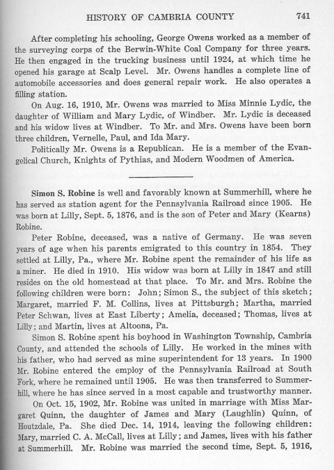 After completing his schooling, George Owens worked as a member of the surveying corps of the Berwin-White Coal Company for three years. He then engaged in the trucking business until 1924, at which time he opened his garage at Scalp Level. Mr. Owens handles a complete line of automobile accessories and does general repair work. He also operated a filling station. Simon S. Robine is well and favorably known at Summerhill, where he has served as station agent for the Pennsylvania Railroad since 1905. He was born at Lilly, Sept. 5, 1876, and is the son of Peter and Mary (Kearns) Robine. Peter Robine, deceased, was a native of Germany. He was seven years of age when his parents emigrated to this country in 1954. They settled at Lilly, Pa., where Mr. Robine spent the remainder of his life as a miner. He died in 1910. His widow was born at Lilly in 1847 and still resides on the old homestead at that place. To Mr. and Mrs. Robine the following children were born: John; Simon S., the subject of this sketch; Margaret, married F. M. Collins, lives at Pittsburgh; Martha, married Peter Schwan, lives at East Liberty; Amelia, deceased; Thomas, lives at Lilly; and Martin, lives at Altoona, Pa. Simon S. Robine spent his boyhood in Washington Township, Cambria County, and attended the schools of Lilly. He worked in the mines with his father, who had served as mine superintendent for 13 years. In 1900 Mr. Robine entered the employ of the Pennsylvania Railroad at South Fork, where he remained until 1905. He was then transferred to Summerhill, where he has since served in a most capable and trustworthy manner. On Oct. 15, 1902, Mr. Robine was united in marriage with Miss Margaret Quinn, the daughter of James and Mary (Laughlin) Quinn, of Houtzdale, Pa. She died Dec. 14, 1914, leaving the following children: Mary, married C. A. McCall, lives at Lilly; and James, lives with his father at Summerhill. Mr. Robine was married the second time, Sept. 5, 1916, |