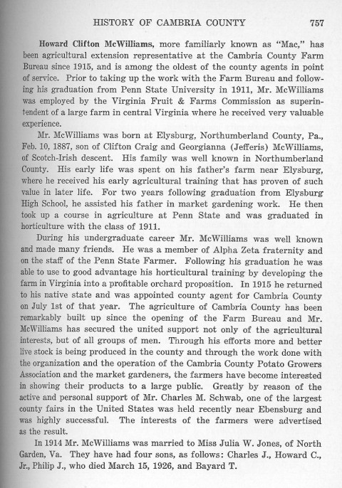 Mr. McWilliams was born at Elysburg, Northumberland County, Pa., Feb. 10, 1887, son of Clifton Craig and Georgianna (Jefferis) McWilliams, of Scotch-Irish descent. His family was well known in Northumberland County. His early life was spent on his father's farm near Elysburg, where he received his early agricultural training that has proven of such value in later life. For two years following graduation from Elysburg High School, he assisted his father in market gardening work. He then took up a course in agriculture at Penn State and was graduated in horticulture with the class of 1911.