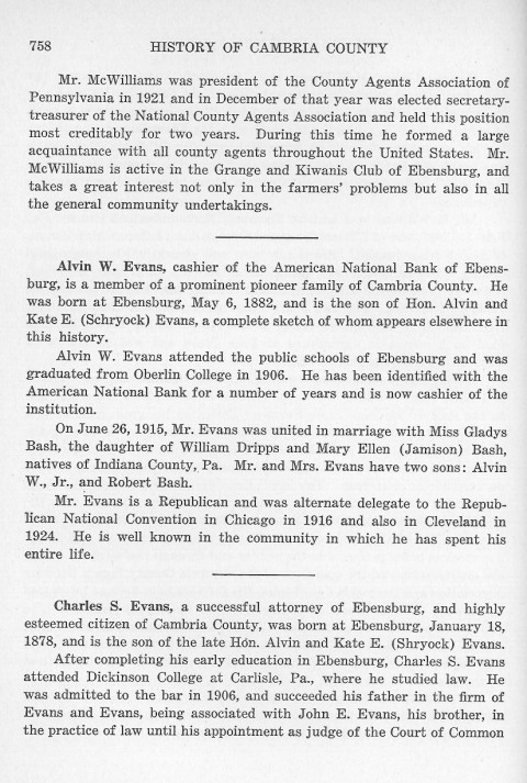 Mr. McWilliams was president of the County Agents Association of Pennsylvania in 1921 and in December of that year was elected secretary-treasurer of the National County Agents Association and held this position most creditably for two years. During this time he formed a large acquaintance with all county agents throughout the United States. Mr. McWilliams is active in the Grange and Kiwanis Club of Ebensburg, and takes a great interest not only in the farmers' problems but also in all the general community undertakings. Alvin W. Evans, cashier of the American National Bank of Ebensburg, is a member of a prominent pioneer family of Cambria County. He was born at Ebensburg, May 6, 1882, and is the son of Hon. Alvin and Kate E. (Schryock) Evans, a complete sketch of whom appears elsewhere in this history. Alvin W. Evans attended the public schools of Ebensburg and was graduated from Oberlin College in 1906. He has been identified with the American National Bank for a number of years and is now cashier of the institution. On June 26, 1915, Mr. Evans was united in marriage with Miss Gladys Bash, the daughter of William Dripps and Mary Ellen (Jamison) Bash, natives of Indiana County, Pa. Mr. and Mrs. Evans have two sons: Alvin W., Jr., and Robert Bash. Mr. Evans is a Republican and was alternate delegate to the Republican National Convention in Chicago in 1916 and also in Cleveland in 1924. He is well known in the community in which he has spent his entire life. Charles S. Evans, a successful attorney of Ebensburg, and highly esteemed citizen of Cambria County, was born at Ebensburg, January 18, 1878, and is the son of the late Hon. Alvin and Kate E. (Shryock) Evans. After completing his early education in Ebensburg, Charles S. Evans attended Dickinson College at Carlisle, Pa., where he studied law. He was admitted to the bar in 1906, and succeeded his father in the firm of Evans and Evans, being associated with John E. Evans, his brother, in the practice of law until his appointment as judge of the Court of Common |