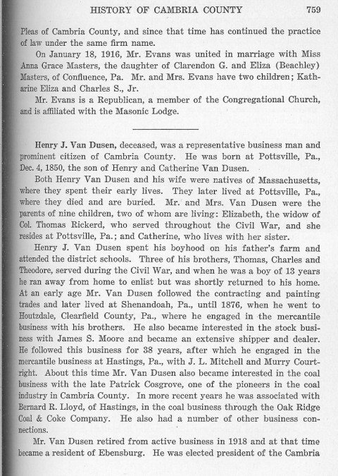 Pleas of Cambria County, and since that time has continued the practice of law under the same firm name. Henry J. Van Dusen, deceased, was a representative business man and prominent citizen of Cambria County. He was born at Pottsville, Pa., Dec. 4, 1850, the son of Henry and Catherine Van Dusen. Both Henry Van Dusen and his wife were natives of Massachusetts, where they spent their early lives. They later lived at Pottsville, Pa., where they died and are buried. Mr. and Mrs. Van Dusen were the parents of nine children, two of whom are living: Elizabeth, the widow of Col. Thomas Rickerd, who served throughout the Civil War, and she resides at Pottsville, Pa.; and Catherine, who lives with her sister. Henry J. Van Dusen spent his boyhood on his father's farm and attended the district schools. Three of his brothers, Thomas, Charles and Theodore, served during the Civil War, and when he was a boy of 13 years he ran away from home to enlist but was shortly returned to his home. At an early age Mr. Van Dusen followed the contracting and painting trades and later lived at Shenandoah, Pa., until 1876, when he went to Houtzdale, Clearfield County, Pa., where he engaged in the mercantile business with his brothers. He also became interested in the stock business with James S. Moore and became an extensive shipper and dealer. He followed this business for 38 years, after which he engaged in the mercantile business at Hastings, Pa., with J. L. Mitchell and Murry Courtright. About this time Mr. Van Dusen also became interested in the coal business with the late Patrick Cosgrove, one of the pioneers in the coal industry in Cambria County. In more recent years he was associated with Bernard R. Lloyd, of Hastings, in the coal business through the Oak Ridge Coal & Coke Company. He also had a number of other business connections. Mr. Van Dusen retired from active business in 1918 and at that time became a resident of Ebensburg. He was elected president of the Cambria |