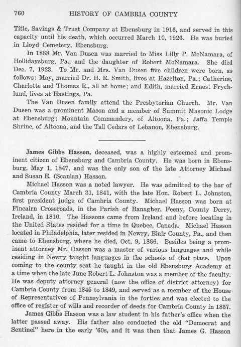 Title, Savings & Trust Company at Ebensburg in 1916, and served in this capacity until his death, which occurred March 10, 1926. He was buried in Lloyd Cemetery, Ebensburg. James Gibbs Hasson, deceased, was a highly esteemed and prominent citizen of Ebensburg and Cambria County. He was born in Ebensburg, May 1, 1847, and was the only son of the late Attorney Michael and Susan E. (Scanlan) Hasson. Michael Hasson was a noted lawyer. He was admitted to the bar of Cambria county March 31, 1841, with the late Hon. Robert L. Johnston, first president judge of Cambria County. Michael Hasson was born at Fincairn Crossroads, in the Parish of Banagher, Feeny, County Derry, Ireland, in 1810. The Hassons came from Ireland and before locating in the United States resided for a time in Quebec, Canada. Michael Hasson located in Philadelphia, later resided in Newry, Blair County, Pa., and then came to Ebensburg, where he died, Oct. 9, 1866. Besides being a prominent attorney Mr. Hasson was a master of various languages and while residing in Newry taught languages in the schools of that place. Upon coming to the county seat he taught in the old Ebensburg Academy at a time when the late June Robert L. Johnston was a member of the faculty. He was deputy attorney general (now the office of district attorney) for Cambria County from 1845 to 1849, and served as a member of the House of Representatives of Pennsylvania in the forties and was elected to the office of register of wills and recorder of deeds for Cambria County in 1857. James Gibbs Hasson was a law student in his father's office when the latter passed away. His father also conducted the old "Democrat and Sentinel" here in the early '60s, and it was then that James G. Hasson |