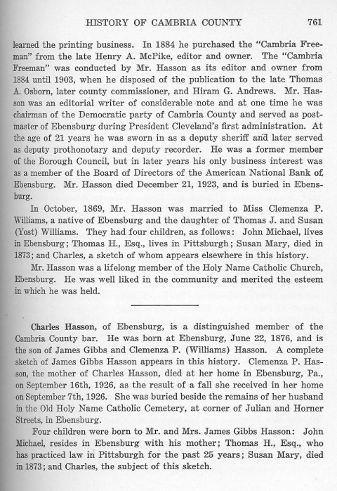 learned the printing business. In 1884 he purchased the "Cambria Freeman" from the late Henry A. McPike, editor and owner. The "Cambria Freeman" was conducted by Mr. Hasson as its editor and owner from 1884 until 1903, when he disposed of the publication to the late Thomas A. Osborn, later county commissioner, and Hiram G. Andrews. Mr. Hasson was an editorial writer of considerable note and at one time he was chairman of the Democratic party of Cambria County and served as postmaster of Ebensburg during President Cleveland's first administration. At the age of 21 years he was sworn in as a deputy sheriff and later served as deputy prothonotary and deputy recorder. He was a former member of the Borough Council, but in later years his only business interest was as a member of the Board of Directors of the American National Bank of Ebensburg. Mr. Hasson died December 21, 1923, and is buried in Ebensburg. Charles Hasson, of Ebensburg, is a distinguished member of the Cambria County bar. He was born at Ebensburg, June 22, 1876, and is the son of James Gibbs and Clemenza P. (Williams) Hasson. A complete sketch of James Gibbs Hasson appears in this history. Clemenza P. Hasson, the mother of Charles Hasson, died at her home in Ebensburg, Pa., on September 16th, 1926, as a result of a fall she received in her home on September 7th, 1926. She was buried beside the remains of her husband in the Old Holy Name Catholic Cemetery, at corner of Julian and Horner Streets, in Ebensburg. Four children were born to Mr. and Mrs. James Gibbs Hasson: John Michael, resides in Ebensburg with his mother; Thomas H., Esq., who has practiced law in Pittsburgh for the past 25 years; Susan Mary, died in 1873; and Charles, the subject of this sketch. |