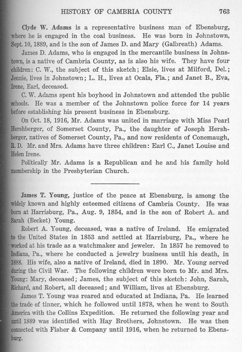 Clyde W. Adams is a representative business man of Ebensburg, where he is engaged in the coal business. He was born in Johnstown, Sept. 10, 1889, and is the son of James D. and Mary (Galbreath) Adams. James T. Young, justice of the peace at Ebensburg, is among the widely known and highly esteemed citizens of Cambria County. He was born at Harrisburg, Pa., Aug. 9, 1854, and is the son of Robert A. and Sarah (Becket) Young. Robert A. Young, deceased, was a native of Ireland. He emigrated to the United States in 1853 and settled at Harrisburg, Pa., where he worked at his trade as a watchmaker and jeweler. In 1857 he removed to Indiana, Pa., where he conducted a jewelry business until his death, in 1886. His wife, also a native of Ireland, died in 1890. Mr. Young served during the Civil War. The following children were born to Mr. and Mrs. Young: Mary, deceased; James, the subject of this sketch; John, Sarah, Richard, and Robert, all deceased; and William, lives at Ebensburg. James T. Young was reared and educated at Indiana, Pa. He learned the trade of tinner, which he followed until 1878, when he went to South America with the Collins Expedition. He returned the following year and until 1889 was identified with Hay Brothers, Johnstown. He was then connected with Fisher & Company until 1916, when he returned to Ebensburg. |