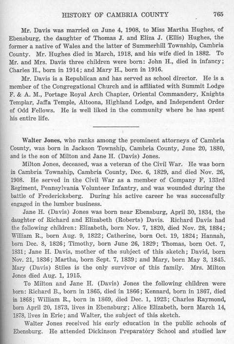 Mr. Davis was married on June 4, 1908, to Miss Martha Hughes, of Ebensburg, the daughter of Thomas J. and Eliza J. (Ellis) Hughes, the former a native of Wales and the latter of Summerhill Township, Cambria County. Mr. Hughes died in March, 1918, and his wife died in 1882. To Mr. and Mrs. Davis three children were born: John H., died in infancy; Charles H., born in 1914; and Mary H., born in 1916. Walter Jones, who ranks among the prominent attorneys of Cambria County, was born in Jackson Township, Cambria County, June 20, 1880, and is the son of Milton and Jane H. (Davis) Jones. Milton Jones, deceased, was a veteran of the Civil war. He was born in Cambria Township, Cambria County, Dec. 6, 1829, and died Nov. 26, 1908. He served in the Civil War as a member of Company F, 133rd Regiment, Pennsylvania Volunteer Infantry, and was wounded during the battle of Fredericksburg. During his active career he was successfully engaged in the lumber business. Jane H. (Davis) Jones was born near Ebensburg, April 30, 1834, the daughter of Richard and Elizabeth (Roberts) Davis. Richard Davis had the following children: Elizabeth, born Nov. 7, 1820, died Nov. 28, 1884; William R., born Aug. 9, 1822; Catherine, born Oct. 19, 1824; Hannah, born Dec. 8, 1826; Timothy, born June 26, 1829; Thomas, born Oct. 7, 1831; Jane H. Davis, mother of the subject of this sketch; David, born Nov. 21, 1836; Martha, born Sept. 7, 1839; and Mary, born May 3, 1845. Mary (Davis) Stiles is the only survivor of this family. Mrs. Milton Jones died Aug. 1, 1915. To Milton and Jane H. (Davis) Jones the following children were born: Richard B., born in 1865, died in 1866; Kennard, born in 1867, died in 1868; William R., born in 1869, died Dec. 1, 1923; Charles Raymond, born April 20, 1873, lives in Ebensburg; Alice Elizabeth, born March 14, 1878, lives in Erie; and Walter, the subject of this sketch. Walter Jones received his early education in the public schools of Ebensburg. He attended Dickinson Preparatory School and studied law |
