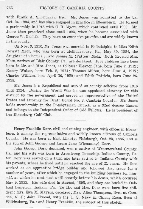 with Frank A. Shoemaker, Esq. Mr. Jones was admitted to the bar Oct. 24, 1904, and has since engaged in practice in Ebensburg. He formed a partnership in 1915 with C. R. Myers, which continued until 1920. Mr. Jones then practiced alone until 1923, when he became associated with George W. Griffith. They have an extensive practice and are widely known in the county. Henry Franklin Dorr, civil and mining engineer, with offices in Ebensburg, is among the representative and widely known citizens of Cambria County. He was born at East Liberty, Pittsburgh, Oct. 23, 1885, and is the son of John George and Laura Jane (Flemming) Dorr. John George Dorr, deceased, was a native of Westmoreland County, Pa., and his wife was born in Armstrong Township, Indiana county, Pa. Mr. Dorr was reared on a farm and later settled in Indiana County with his parents, where he lived until he reached the age of 21 years. He then worked as an apprentice bridge builder and followed that trade for number of years, after which he engaged in the building business for himself, at which he continued until shortly before his death, which occurred May 9, 1922. His wife died in August, 1895, and they are buried in Oakland Cemetery, Indiana, Pa. To Mr. and Mrs. Dorr were born five children: Mrs. Eva M. Mayers, deceased; Mrs. Alice Thompson, lives at Camden, N. J.; John Elwood, with the U. S. Navy in China; Enos, lives at Wilkinsburg, Pa.; and Henry Franklin, the subject of this sketch. |