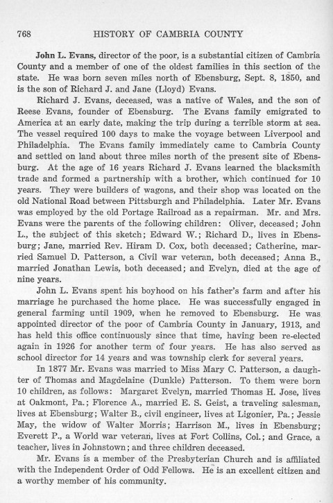 Richard J. Evans, deceased, was a native of Wales, and the son of Reese Evans, founder of Ebensburg. The Evans family emigrated to America at an early date, making the trip during a terrible storm at sea. The vessel required 100 days to make the voyage between Liverpool and Philadelphia. The Evans family immediately came to Cambria County and settled on land about three miles north of the present site of Ebensburg. At the age of 16 years Richard J. Evans learned the blacksmith trade and formed a partnership with a brother, which continued for 10 years. They were builders of wagons, and their shop was located on the old National road between Pittsburgh and Philadelphia. Later Mr. Evans was employed by the old Portage Railroad as a repairman. Mr. and Mrs. Evans were the parents of the following children: Oliver, deceased; John L., the subject of this sketch; Edward W.; Richard D., lives in Ebensburg; Jane, married Rev. Hiram D. Cox, both deceased; Catherine, married Samuel D. Patterson, a Civil war veteran, both deceased; Anna B., married Jonathan Lewis, both deceased; and Evelyn, died at the ago of nine years.