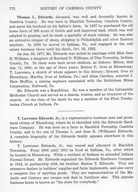 Thomas L. Edwards, deceased, was well and favorably known in Cambria County. He was born in Blacklick Township, Cambria County, and spent his boyhood on his father's farm. In 1887 he purchased the old home farm of 200 acres of fertile and well improved land, which was well adapted to grazing, and he made a specialty of stock raising. He was also an extensive shipper of sheep, shipping to Philadelphia and other Eastern markets. In 1903 he moved to Indiana, Pa., and engaged in the real estate business there until his death, Oct. 25, 1922. T. Lawrence Edwards, Jr., is a representative business man and prominent citizen of Ebensburg, where he is identified with the Edwards Hardware Company. He was born on a farm in Blacklick township, Cambria County, and is the son of Thomas L. and Jane E. (Williams) Edwards. A complete biography of the Edwards family appears elsewhere in this history. T. Lawrence Edwards, Jr., was reared and educated in Blacklick Township. From 1903 until 1913 he lived at Indiana, Pa., after which he located in Ebensburg. While a resident of Indiana he attended Indiana Normal School. Mr. Edwards organized the Edwards Hardware Company in 1913, in partnership with his brother, Benton T. Edwards. They are extensive dealers in builders' supplies and farm implements, and also carry a complete line of sporting goods. They are representatives of the Majestic and Century gas ranges and deal in furniture also. This popular business house is known as "the store for everybody. |