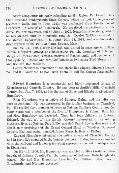 After completing his early schooling at Mt. Union, Dr. Fred H. McClain attended Pennsylvania State College, where he took three years of pre-medic work, and in June, 1923, was graduated from the School of Dentistry, University of Pittsburgh. He practiced his profession at Indiana, Pa., for two years and on June 1, 1925, located in Ebensburg, where he has already built up a splendid practice. Doctor McClain enlisted in the Medical Department, U. S. Army, May 28, 1918, and was honorably discharged May 28, 1919, at Camp Devens, Mass. Edward Humphrey is a substantial and highly esteemed citizen of Ebensburg and Cambria County. He was born at Smith's Mills, Clearfield County, Pa., Jan. 7, 1872, and is the son of Elias and Elizabeth (Stoddard) Humphrey. Elias Humphrey was a native of Bangor, Maine, and his wife was born in Scotland. He was interested in the lumber business at Clearfield, Pa. He resided for a number of years at Patton, Cambria County, and for many years was a member of the firm of Humphrey & Flynn. Both Mr. and Mrs. Humphrey are deceased. They had four children, as follows: Edward, the subject of this sketch; George, interested in the mining business, lives in Patton, Pa.; Lillie, married David Lewis, deceased, and she is now proprietor of the Grand Central Hotel at Windber, Somerset County, Pa.; and Anna, married James Forsyth, lives at Patton. Edward Humphrey attended the public schools of Clearfield County and in early life engaged in the lumber business. Later, he was connected with the railroad and is now a traveling representative, with headquarters in Ebensburg. On May 16, 1906, Mr. Humphrey was married to Miss Cordelia Buterbaugh, of Indiana County, Pa., the daughter of Solomon Buterbaugh, deceased. Mr. and Mrs. Humphrey have had two children: Glen, lives in Pittsburgh; and Norman, deceased. |