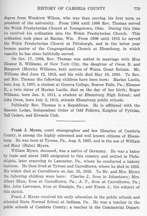 degree from Woodrow Wilson, who was then serving his first term as president of the university. From 1904 until 1906 Rev. Thomas served the Welsh Presbyterian Church at Youngstown, Ohio. During this time he received his ordination into the Welsh Presbyterian Church. This ordination took place at Racine, Wis. From 1906 until 1913 he served the Welsh Presbyterian Church at Pittsburgh, and in the latter year became pastor of the Congregational Church at Ebensburg, in which capacity he has since faithfully served. Frank J. Myers, court stenographer and law librarian of Cambria County, is among the highly esteemed and well known citizens of Ebensburg. He was born at Tyrone, Pa., Aug. 9, 1887, and is the son of William and Mary (Bube) Myers. William Myers, deceased, was a native of Germany. He was a baker by trade and about 1865 emigrated to this country and settled in Philadelphia, later removing to Lancaster, Pa., where he conducted a bakery business. He then lived at Tyrone and Carrolltown, where he died in 1893. His widow died at Carrolltown on Jan. 23, 1926. To Mr. and Mrs. Myers the following children were born: Charles J., lives in Johnstown; Mrs. Albert Blum, lives at Carrolltown, Pa.; A.P., lives at Carrolltown, Pa.; Mrs. John Lawrence, lives at Emeigle, Pa.; and Frank J., the subject of this sketch. Frank J. Myers received his early education in the public schools and attended State Normal School at Indiana, Pa. He was a teacher in the public schools of Cambria County; a teacher in the Commercial Depart- |