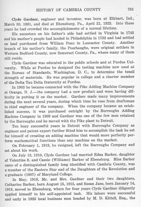 In May, 1919, Mr. and Mrs. Gardner and their two daughters, Catharine Barker, born August 15, 1915, and Susan Jane, born January 14, 1919, moved to Ebensburg, where for four years Clyde Gardner diligently applied himself to his self-appointed task. His labors were successful and early in 1923 local business men headed by M. D. Kittell, Esq., the