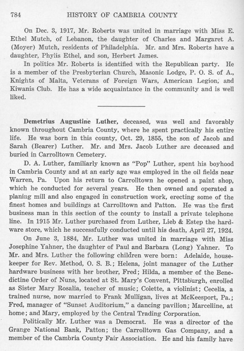 On Dec. 3, 1917, Mr. Roberts was united in marriage with Miss E. Ethel Mutch, of Lebanon, the daughter of Charles and Margaret A. (Moyer) Mutch, residents of Philadelphia. Mr. and Mrs. Roberts have a daughter, Phylis Ethel, and son, Herbert James. Demetrius Augustine Luther, deceased, was well and favorably known throughout Cambria County, where he spent practically his entire life. He was born in this county, Oct. 29, 1855, the son of Jacob and Sarah (Bearer) Luther. Mr. and Mrs. Jacob Luther are deceased and buried in Carrolltown Cemetery. D. A. Luther, familiarly known as "Pop" Luther, spent his boyhood in Cambria County and at an early age was employed in the oil fields near Warren, Pa. Upon his return to Carrolltown he opened a paint shop, which he conducted for several years. He then owned and operated a planing mill and also engaged in construction work, erecting some of the finest homes and buildings at Carrolltown and Patton. He was the first business man in this section of the county to install a private telephone line. In 1915 Mr. Luther purchased from Luther, Lieb & Estep the hardware store, which he successfully conducted until his death, April 27, 1924. On June 3, 1884, Mr. Luther was united in marriage with Miss Josephine Yahner, the daughter of Paul and Barbara (Long) Yahner. To Mr. and Mrs. Luther the following children were born: Adelaide, housekeeper for Rev. Method, O. S. B.; Helena, joint manager of the Luther hardware business with her brother, Fred; Hilda, a member of the Benedictine Order of Nuns, located at St. Mary's Convent, Pittsburgh, enrolled as Sister Mary Rosalia, teacher of music; Colette, a violinist; Cecelia, a trained nurse, now married to Frank Mulligan, lives at McKeesport, Pa.; Fred, manager of "Sunset Auditorium," a dancing pavilion; Marcelline, at home; and Mary, employed by the Central Trading Corporation. Politically Mr. Luther was a Democrat. He was a director of the Grange National Bank, Patton; the Carrolltown Gas Company, and a member of the Cambria County Fair Association. He and his family have |