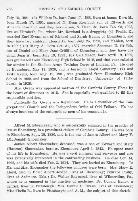 July 18, 1921; (2) William D., born June 17, 1888, lives at home; Dora M., born March 17, 1891, married N. Dean Rowland, son of Ellworth and Amanda Rowland, and they have a son, N. Dean, Jr., born Feb. 23, 1923, live at Elizabeth, Pa., where Mr. Rowland is a druggist; (4) Freida K., married Earl Evans, son of Richard and Sarah Evans, of Ebensburg, and they have two children, Henrietta, born July 25, 1920, and Mahlan, born in 1922; (5) Mary A., born Oct. 31, 1897, married Sherman D. Griffith, son of Daniel and Mary A., born July 19, 1923; (6) Carl Mason, born April 19, 1899, was graduated from Ebensburg High School in 1918, and that year enlisted for service in the Student Army training Corps at Indiana, Pa. He died at Ebensburg, May 17, 1920, and is buried in Lloyd Cemetery; (7) and Fritz Krebs, born Aug. 19, 1901, was graduated from Ebensburg High School in 1922, and from the School of Dentistry, University of Pittsburgh, in 1926. Alfred M. Shoemaker, who is successfully engaged in the practice of law at Ebensburg, is a prominent citizen of Cambria County. He was born in Ebensburg, Sept. 15, 1880, and is the son of James Albert and Mary V. (McDonald) Shoemaker. James Albert Shoemaker, deceased, was a son of Edward and Mary (Hanson) Shoemaker, born at Ebensburg April 3, 1843. He spent most of his life in Ebensburg. He was a Civil engineer and surveyor and also was extensively interested in the contracting business. He died Oct. 14, 1902, and his wife died Feb. 3, 1914. They are buried at Ebensburg. To Mr. and Mrs. Shoemaker the following children were born. Mrs. Mary E Lloyd, died in 1925; Albert Joseph, lives at Ebensburg; Edward Philip, lives at Ardmore, Okla.; Dr. Walter Raymond, lives at Wilmerding, Pa., where he is engaged in the practice of medicine; Dr. Donald Henry, a dentist, lives in Pittsburgh; Mrs. Fannie S. Evans, lives at Ebensburg; Miss Theila R., lives in Pittsburgh; and A. M., the subject of this sketch. |