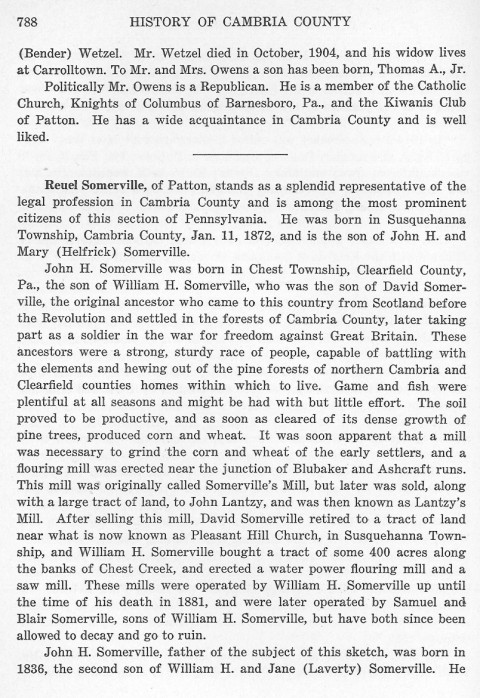 (Bender) Wetzel. Mr. Wetzel died in October, 1904, and his widow lives at Carrolltown. To Mr. and Mrs. Owens a son has been born, Thomas A., Jr. Reuel Somerville, of Patton, stands as a splendid representative of the legal profession in Cambria County and is among the most prominent citizens of this section of Pennsylvania. He was born in Susquehanna Township, Cambria County, Jan. 11, 1872, and is the son of John H. and Mary (Helfrick) Somerville. John H. Somerville was born in Chest Township, Clearfield County Pa., the son of William H. Somerville, who was the son of David Soomerville, the original ancestor who came to this country from Scotland before the Revolution and settled in the forests of Cambria County, laer taking part as a soldier in the war for freedom against Great Britain. These ancestors were a strong, sturdy race of people, capable of battling with the elements and hewing out of the pine forest of northern Cambria and Clearfield counties homes within which to live. Game and fish were plentiful at all seasons and might be had with but little effort. The soil proved to be productive, and as soon as cleared of its dense growth of pine trees, produced corn and wheat. It was soon apparent that a mill was necessary to grind the corn and wheat of the early settlers, and a flouring mill was erected near the junction of Blubaker and Ashcraft runs. This mill was originally called Somerville's Mill, but later was sold, along with a large tract of land, to John Lantzy, and was then known as Latzy's Mill. After selling this mill, David Somerville retired to a tract of land near what is now known as Pleasant Hill Church, in Susquehanna Township, and William H. Somerville bought a tract of some 400 acres along the banks of Chest Creek, and erected a water power flouring mill and a saw mill. These mills were operated by William H. Somerville up until the time of his death in 1881, and were later operated by Samuel and Blair Somerville, sons of William H. Somerville, but have both since been allowed to decay and go to ruin. John H. Somerville, father of the subject of this sketch, was born in 1836, the second son of William H. and Jane (Laverty) Somerville. He |