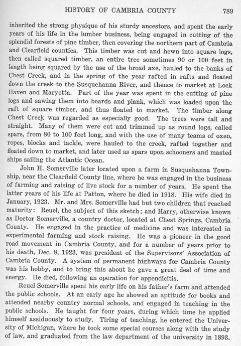 John H. Somerville later located upon a farm in Susquehanna township, near the Clearfield County line, where he was engaged in ghe business of farming and raising of live stock for a number of years. He spent the latter years of his life at Patton, where he died in 1918. His wife died in January, 1923. Mr. and Mrs. Somerville had but two children that reached maturity: Reuel, the subject of this sketch; and Harry, otherwise known as Doctor Somerville, a country doctor, located at Chest Springs, Cambria County. He engaged in the practice of medicine and was interested in experimental farming and stock raising. He was a pioneer in the good road movement in Cambria County, and for a number of years prior to his death, Dec. 8, 1923, was president of the Supervisors' Association of Cambria County. A system of permanent highways for Cambria County was his hobby, and to bring this about he gave a great deal of time and energy. He died, following an operation for appendicitis.