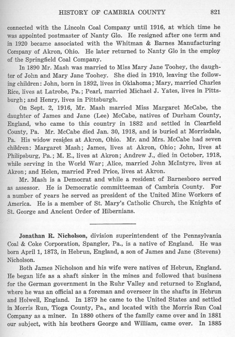 connected with the Lincoln Coal Company until 1916, at which time he was appointed postmaster of Nanty Glo. He resigned after one term and in 1920 became associated with the Whitman & Barnes Manufacturing Company of Akron, Ohio. He later returned to Nanty Glo in the employ of the Springfield Coal Company. Jonathan R. Nicholson, division superintendent of the Pennsylvania Coal & Coke Corporation, Spangler, Pa., is a native of England. He was born April 1, 1873, in Hebrun, England, a son of James and Jane (Stevens) Nicholson. Both James Nicholson and his wife were natives of Hebrun, England. He began life as a shaft sinker in the mines and followed that business for the German government in the Ruhr Valley and returned to England, where he was an official as a foreman and overseer in the shafts in Hebrun and Holwell, England. In 1879 he came to the United States and settled in Morris Run, Tioga County, Pa., and located with the Morris Run Coal Company as a miner. In 1880 others of the family came over and in 1881 our subject, with his brothers George and William, came over. In 1885 |