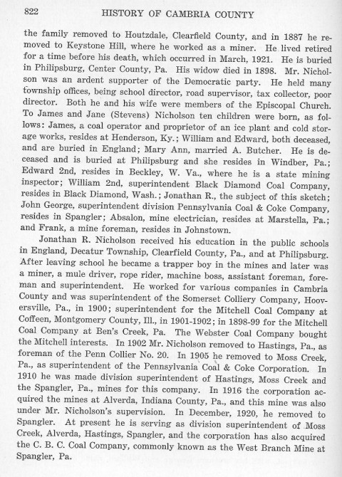 the family removed to Houtzdale, Clearfield County, and in 1887 he removed to Keystone Hill, where he worked as a miner. He lived retired for a time before his death, which occurred in March 1921. He is buried in Philipsburg, Center Country, Pa. His widow died in 1898. Mr. Nicholson was an ardent supporter of the Democratic party. He held many township offices, being school director, road supervisor, tax collector, poor director. Both he and his wife were members of the Episcopal Church. To James and Jane (Stevens) Nicholson ten children were born, as follows: James, a coal operator and proprietor of an ice plant and cold storage works, resides at Henderson, Ky.; William and Edward, both deceased, and are buried in England; Mary Ann, married A. Butcher. He is deceased and is buried at Philipsburg and she resided in Windber, Pa.; Edward 2nd, resides in Beckley, W. Va., where he is a state mining inspector; William 2nd, superintendent Black Diamond Coal Company, resides in Black Diamond, Wash.; Jonathan R., the subject of this sketch; John George, superintendent division Pennsylvania Coal & Coke Company, resides in Spangler; Absalon, mine electrician, resides at Marstella, Pa.; and Frank, a mine foreman, resides in Johnstown.