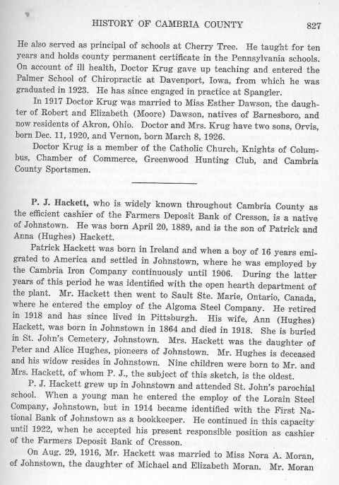 He also served as principal of schools at Cherry Tree. He taught for ten years and holds county permanent certificate in the Pennsylvania Schools. On account of ill health, Doctor Krug gave up teaching and entered the Palmer School of Chiropractic at Davenport, Iowa, from which he was graduated in 1923. He has since engaged in practice at Spangler. P. J. Hackett, who is widely known throughout Cambria County as the efficient cashier of the Farmers Deposit Bank of Cresson, is a native of Johnstown. He was born April 20, 1889, and is the son of Patrick and Anna (Hughes) Hackett. Patrick Hackett was born in Ireland and when a boy of 16 years emigrated to America and settled in Johnstown, where he was employed by the Cambria Iron Company continuously until 1906. During the latter years of this period he was identified with the open hearth department of the plant. Mr. Hackett then went to Sault Ste. Marie, Ontario, Canada, where he entered the employ of the Algoma Steel Company. He retired in 1918 and has since lived in Pittsburgh. His wife, Ann (Hughes) Hackett, was born in Johnstown in 1864 and died in 1918. She is buried in St. John's Cemetery, Johnstown. Mrs. Hackett was the daughter of Peter and Alice Hughes, pioneers of Johnstown. Mr. Hughes is deceased and his widow resides in Johnstown. Nine children were born to Mr. and Mrs. Hackett, of whom P.J. the subject of this sketch, is the oldest. P.J. Hackett grew up in Johnstown and attended St. John's parochial school. When a young man he entered the employ of the Lorain Steel Company, Johnstown, but in 1914 became identified with the First National Bank of Johnstown as a bookkeeper. He continued in this capacity until 1922, when he accepted his present responsible position as cashier of the Farmers Deposit Bank of Cresson. On Aug. 29, 1916, Mr. Hackett was married to Miss Nora A. Moran, of Johnstown, the daughter of Michael and Elisabeth Moran. Mr. Moran |