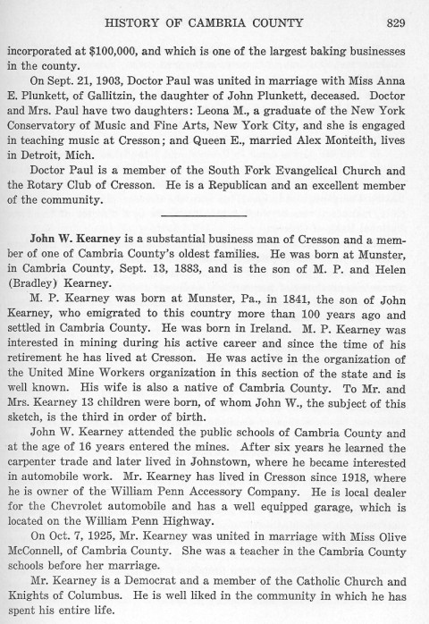 incorporated at $100,000, and which is one of the largest baking businesses in the county. John W. Kearney is a substantial business man of Cresson and a member of Cambria County's oldest families. He was born at Munster, in Cambria County, Set. 13, 1883, and is the son of M.P. and Helen (Bradley) Kearney. M.P. Kearney was born at Munster, Pa., in 1841, the son of John Kearney, who emigrated to this country more than 100 years ago and settled in Cambria County. He was born in Ireland. M.P. Kearney was interested in mining during his active career and since the time of his retirement he has lived at Cresson. He was active in the organization of the United Mine Workers organization in this section of the state and is well known. His wife is also a native of Cambria County. To Mr. and Mrs. Kearney 13 children were born, of whom John W., the subject of this sketch, is the third in order of birth. John W. Kearney attended the public schools of Cambria County and at the age of 16 years entered the mines. After six years he learned the carpenter trade and later lived in Johnstown, where he became interested in automobile work. Mr. Kearney has lived in Cresson since 1918, where he is owner of the William Penn Accessory Company. He is local dealer for the Chevrolet automobile and has a well equipped garage, which is located on the William Penn Highway. On Oct. 7, 1925, Mr. Kearney was united in marriage with Miss Olive McConnell, of Cambria County. She was a teacher in Cambria County schools before her marriage. Mr. Kearney is a Democrat and a member of the Catholic Church and Knights of Columbus. He is well liked in the community in which he has spent his entire life. |