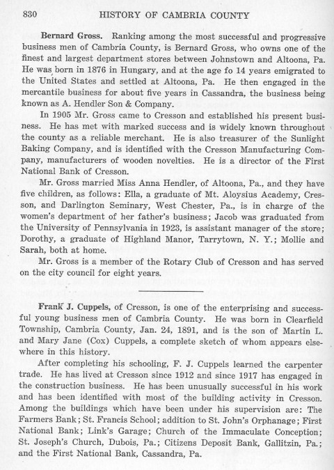 Bernard Gross. Ranking among the most successful and progressive business men of Cambria County, is Bernard Gross, who owns one of the finest and largest department stores between Johnstown and Altoona, Pa. He was born in 1876 in Hungary, and at the age of 14 years emigrated to the United States and settled at Altoona, Pa. He then engaged in the mercantile business for about five years in Cassandra, the business being known as A. Hendler Son & Company. Frank J. Cuppels, of Cresson is one of the enterprising and successful young business men of Cambria County. He was born in Clearfield Township, Cambria County, Jan. 24, 1891, and is the son of Martin L. and Mary Jane (Cox) Cuppels, a complete sketch of whom appears elsewhere in this history. After completing his schooling, F.J. Cuppels learned the carpenter trade. He has lived at Cresson since 1912 and since 1917 has engaged in the construction business. He has been successful in his work and has been identified with most of the building activity in Cresson. Among the buildings which have been under his supervision are: The Farmer's Bank; St. Francis School; addition to St. John's Orphanage; First National Bank; Link's Garage; Church of the Immaculate Conception; St. Joseph's Church, Dubois, Pa.; Citizens Deposit Bank, Gallitzin, Pa.; and the First National Bank, Cassandra, Pa. |