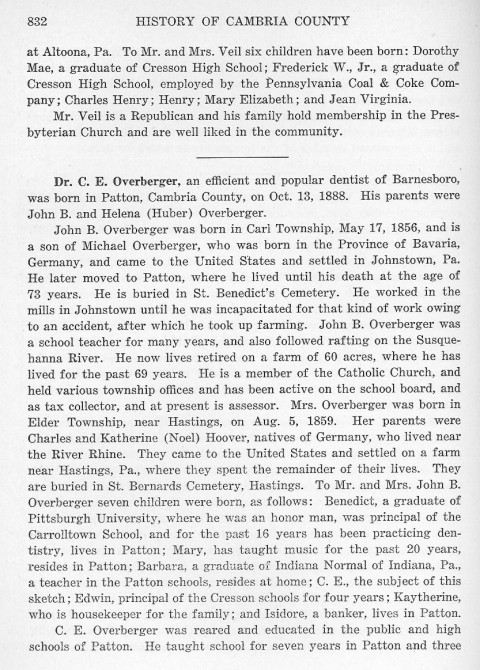 at Altoona, Pa. To Mr. and Mrs. Veil six children have been born: Dorothy Mae, a graduate of Cresson High School; Frederick W., Jr., a graduate of Cresson High School and employed by the Pennsylvania Coal & Coke Company; Charles Henry; Henry; Mary Elizabeth; and Jean Virginia. Dr. C.E. Overberger, an efficient and popular dentist of Barnesboro, was born in Patton, Cambria County, on Oct. 13, 1888. His parents were John B. and Helena (Huber) Overberger. John B. Overberger was born in Carl Township, May 17, 1856, and is a son of Michael Overberger, who was born in the Province of Bavaria, Germany, and came to the United States and settled in Johnstown, Pa. He later moved to Patton, where he lived until his death at the age of 73 years. He is buried in St. Benedict's Cemetery. He worked in the mills in Johnstown until he was incapacitated for that kind of work owing to an accident, after which he took up farming. John B. Overberger was a school teacher for many years, and also followed rafting on the Susquehanna River. He now lives retired on a farm of 60 acres, where he has lived for the past 69 years. He is a member of the Catholic Church, and held various township offices and has been active on the school board, and as tax collector, and at present is assessor. Mrs. Overberger was born in Elder Township, near Hastings, on Aug. 5, 1859. Her parents were Charles and Katherine (Noel) Hoover, natives of Germany, who lived near the River Rhine. They came to the United States and settled on a farm near Hastings, Pa., where they spent the remainder of their lives. They are buried in St. Bernards Cemetery, Hastings. To Mr. and Mrs. John B. Overberger seven children were born, as follows: Benedict, a graduate of Pittsburgh University, where he was an honor man, was principal of the Carrolltown School, and for the past 16 years has been practicing dentistry, lives in Patton; Mary, has taught music for the past 20 years, resides in Patton; Barbara, a graduate of Indiana Normal of Indiana, Pa., a teacher in the Patton schools, resides at home; C.E., the subject of this sketch; Edwin, principal of the Cresson schools for four years; Kaytherine, who is a housekeeper for the family; and Isidore, a banker, lives in Patton. C. E. Overberger was reared and educated in the public and high schools of Patton. He taught school for seven years in Patton and three |