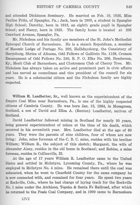 and attended Dickinson Seminary. He married on Feb. 10, 1926, Miss Pauline Fritz, of Spangler, Pa.; Jack, born in 1909, at student in Spangler High School; Dorothy, born in 1913, an eighth grade pupil in Spangler School; and Nancy, born in 1923. The family home is located at 203 Crawford Avenue, Spangler, Pa. William R. Leadbetter, Sr., well known as the superintendent of the Empire Coal Mine near Barnesboro, Pa., is one of the highly respected citizens of Cambria County. He as born Jan. 13, 1864, in Mossgreen, Scotland, a son of David and Eliza A. (Renton) Leadbetter, natives of Scotland. David Leadbetter followed mining in Scotland for nearly 50 years, being general superintendent of mines at the time of his death, which occurred in his seventieth year. Mrs. Leadbetter died at the age of 60 years. They were the parents of nine children, four of whom are now living: John, mine foreman of the C. B. C. mine, resides with his brother William; William R., the subject of this sketch; Margaret, the wife of Alexander Alsey, resides in the old home in Scotland; and Robine, a mine foreman, resides in Collinsville, Ill. At the age of 17 years William R. Leadbetter came to the United States and settled in McIntyre, Lycoming County, Pa., where he was employed in McIntyre No. 4 mine. He remained there until the coal was exhausted, when he went to Clearfield County for the same company he is now connected with, and remained for four years. He spent two years at Rockville, Colo., where he had charge of laying track for the Rockville No. 1 mine under the Atchinson, Topeka & Santa Fe Railroad, after which he returned to the Peale Coal Company, and in 1900 came to Barnesboro |