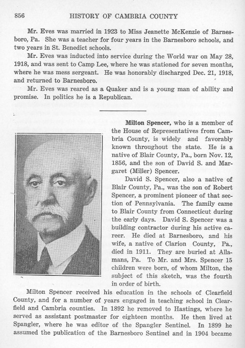 Milton Spencer, who is a member of the House of Representatives from Cambria County, is widely and favorably known throughout the state. He is a native of Blair County, Pa., born Nov. 12, 1856, and the son of David S. and Margaret (Miller) Spencer.David S. Spencer, also a native of Blair County, Pa., was the son of Robert Spencer, a prominent pioneer of that section of Pennsylvania. The family came to Blair County from Connecticut during the early days. David S. Spencer was a building contractor during his active career. He died at Barnesboro, and his wife, a native of Clarion County, Pa., died in 1911. They are buried at Allamans, Pa. To Mr. and Mrs. Spencer 15 children were born, of whom Milton, the subject of this sketch, was the fourth in order of birth. Milton Spencer received his education in the schools of Clearfield County, and for a number of years engaged in teaching school in Clearfield County, and for a number of years engaged in teaching school in Clearfield and Cambria counties. In 1892 he removed to Hastings, where he served as assistant postmaster for eighteen months. He then lived at Spangler, were he was editor of the Spangler Sentinel. In 1899 he assumed the publication of the Barnesboro Sentinel and in 1904 became |