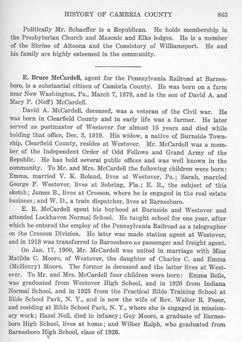 Politically Mr. Schaeffer is a Republican. He holds membership in the Presbyterian Church and Masonic and Elks lodges. He is a member of the Shrine of Altoona and the Consistory of Williamsport. He and his family are highly esteemed in the community. E. Bruce McCardell, agent for the Pennsylvania Railroad at Barnesboro, is a substantial citizen of Cambria County. He was born on a farm near New Washington, Pa., March 7, 1878, and is the son of David A. and Mary P. (Neff) McCardell. David A. McCardell, deceased, was a veteran of the Civil war. He was born in Clearfield County and in early life was a farmer. He later served as postmaster of Westover for almost 15 years and died while holding that office, Dec. 3, 1919. His widow, a native of Burnside Township, Clearfield County, resides at Westover. Mr. McCardell was a member of the Independent Order of Odd Fellows and Grand Army of the Republic. He has held several public offices and was well known in the community. To Mr. and Mrs. McCardell the following children were born: Emma, married V.. K. Roland, lives at Westover, Pa.; Sarah, married George F. Westover, lives at Sebring, Fla.; E. B., the subject of this sketch; James B., lives at Cresson, where he is engaged in the real estate business; and W. D., a train dispatcher, lives at Barnesboro. E. B. McCardell spent his boyhood at Burnside and Westover and attended Lockhaven Normal School. He taught school for one year, after which he entered the employ of the Pennsylvania Railroad as a telegrapher on the Cresson Division. He later made station agent at Westover, and in 1918 was transferred to Barnesboro as passenger and freight agent. On Jan. 17, 1900, Mr. McCardell was united in marriage with Miss Matilda C. Moore, of Westover, the daughter of Charles C. and Emma (McHenry) Moore. The former is deceased and the latter lives at Westover. To Mr. and Mrs. McCardell four children were born: Emma Belle, was graduated from Westover High School, and in 1920 from Indiana Normal School, and in 1925 from the Practical Bible Training School at Bible School park, N. Y., and is now the wife of Rev. Walter R. Feser, and residing at Bible School Park, N. Y., where she is engaged in missionary work; Hazel Nell, died in infancy; Guy Moore, a graduate of Barnesboro High School, lives at home; and Wilber Ralph, who graduated from Barnesboro High School, class of 1926. |