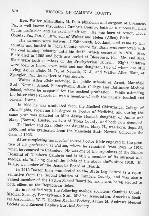 Hon. Walter Allen Blair, M. D., a physician and surgeon of Spangler, Pa., is well known throughout Cambria County, both as a successful man in his profession and an excellent citizen. He was born at Arnot, Tioga County, Pa., Jan. 8, 1875, son of Walter and Helen (Allen) Blair.