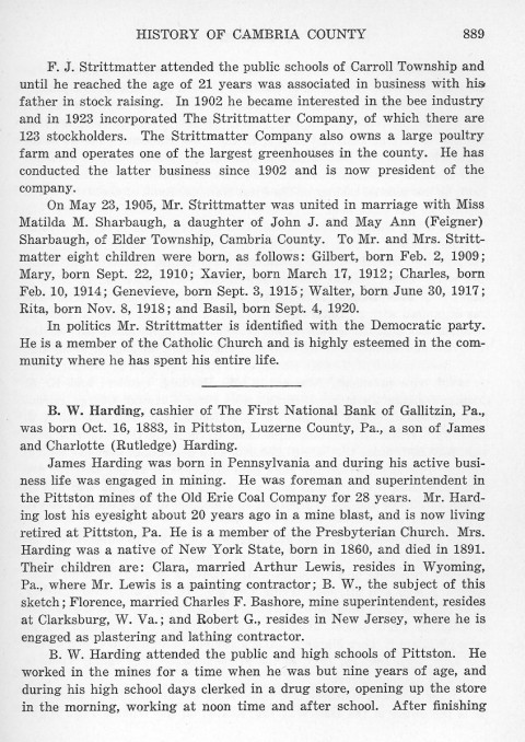 F. J. Strittmatter attended the public schools of Carroll Township and until he reached the age of 21 years was associated in business with his father in stock raising. In 1902 he became interested in the bee industry and in 1923 incorporated The Strittmatter Company, of which there are 123 stockholders. The Strittmatter Company also owns a large poultry farm and operates one of the largest greenhouses in the county. He has conducted the latter business since 1902 and is now president of the company. B. W. Harding, cashier of The First National Bank of Gallitzin, Pa., was born Oct. 16, 1883 in Pittston, Luzerne County, Pa., a son of James and Charlotte (Rutledge) Harding. James Harding was born in Pennsylvania and during his active business life was engaged in mining. He was foreman and superintendent in the Pittston mines of the Old Erie Coal Company for 28 years. Mr. Harding lost his eyesight about 20 years ago in a mine blast, and is now living retired at Pittston, Pa. He is a member of the Presbyterian Church. Mrs. Harding was a native of New York State, born in 1860, and died in 1891. Their children are: Clara, married Arthur Lewis, resides in Wyoming, Pa., where Mr. Lewis is a painting contractor; B.W., the subject of this sketch; Florence, married Charles F. Bashore, mine superintendent, resides at Clarksburg, W.Va.; and Robert G., resides in New Jersey, where he is engaged as plastering and lathing contractor. B.W. Harding attended the public and high schools of Pittston. He worked in the mines for a time when he was but nine years of age, and during his high school days clerked in a drug store, opening up the store in the morning, working at noon time and after school. After finishing |