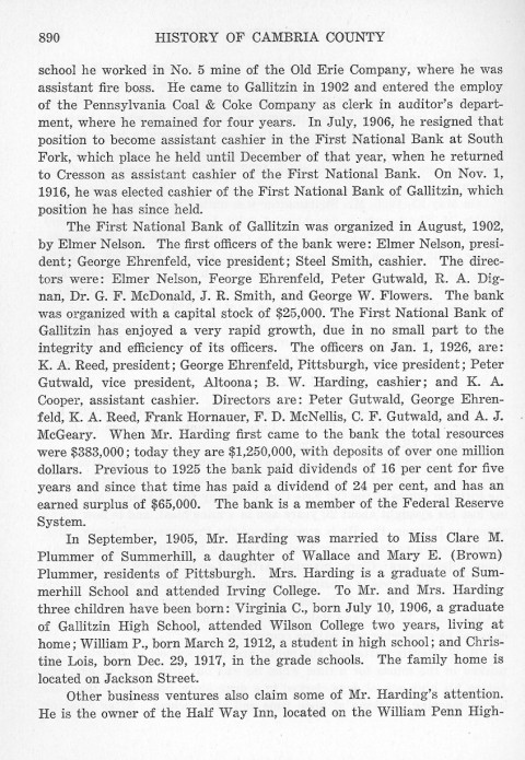 The First National Bank of Gallitzin was organized in August, 1902, by Elmer Nelson. The first officers of the bank were: Elmer Nelson, president; George Ehrenfeld, vice president; Steel Smith, cashier. The directors were: Elmer Nelson, George Ehrenfeld, Peter Gutwald, R. A. Dignan, Dr. G. F. McDonald, J.R. Smith, and George W. Flowers. The bank was organized with a capital stock of $25,000. The First National Bank of Gallitzin has enjoyed a very rapid growth, due in no small part to the integrity and efficiency of its officers. The officers on Jan. 1, 1926, are: K. A. Reed, president; George Ehrenfeld, Pittsburgh, vice president; Peter Gutwald, vice president, Altoona; B.W. Harding, cashier; and K. A. Cooper, assistant cashier. Directors are: Peter Gutwald, George Ehrenfeld, K. A. Reed, Frank Hornauer, F. D. McNellis, C. F. Gutwald, and A. J. McGeary. When Mr. Harding first came to the bank the total resources were $383,000; today they are $1,250,000, with deposits of over one million dollars. Previous to 1925 the bank paid dividends of 16 per cent for five years and since that time has paid a dividend of 24 per cent, and has an earned surplus of $65,000. The bank is a member of the Federal Reserve System.
