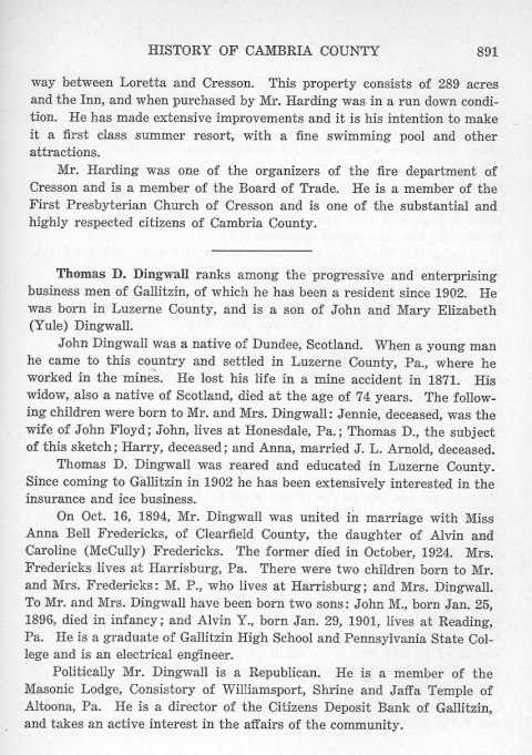 way between Loretta and Cresson. This property consists of 289 acres and the Inn, and when purchased by Mr. Harding was in a run down condition. He has made extensive improvements and it is his intention to make it a first class summer resort, with a fine swimming pool and other attractions. Thomas D. Dingwall ranks among the progressive and enterprising business men of Gallitzin, of which he ahs been a resident since 1902. He was born in Luzerne County, and is a son of John and Mary Elizabeth (Yule) Dingwall. John Dingwall was a native of Dundee, Scotland. When a young man he came to this country and settled in Luzerne County, Pa., where he worked in the mines. He lost his life in a mine accident in 1871. His widow, also a native of Scotland, died at the age of 74 years. The following children were born to Mr. and Mrs. Dingwall; Jennie, deceased, was the wife of John Floyd; John, lives at Honesdale, Pa.; Thomas D., the subject of this sketch; Harry, deceased; and Anna, married J. L. Arnold, deceased. Thomas D. Dingwall was reared and educated in Luzerne County. Since coming to Gallitzin in 1902 he has been extensively interested in the insurance and ice business. On Oct. 16, 1894, Mr. Dingwall was united in marriage with Miss Anna Bell Fredericks, of Clearfield County, the daughter of Alvin and Caroline (McCully) Fredericks. The former died in October, 1924. Mrs. Fredericks lives at Harrisburg, Pa. There were two children born to Mr. and Mrs. Fredericks: M.P., who lives at Harrisburg; and Mrs. Dingwall. To Mr. and Mrs. Dingwall have been born two sons: John M., born Jan. 25, 1896, died in infancy; and Alvin Y., born Jan. 29, 1901, lives at Reading, Pa. He is a graduate of Gallitzin High School and Pennsylvania State College and is an electrical engineer. Politically Mr. Dingwall is a Republican. He is a member of the Masonic Lodge, Consistory of Williamsport, Shrine and Jaffa Temple of Altoona, Pa. He is a director of the Citizens Deposit Bank of Gallitzin, and takes an active interest in the affairs of the community. |