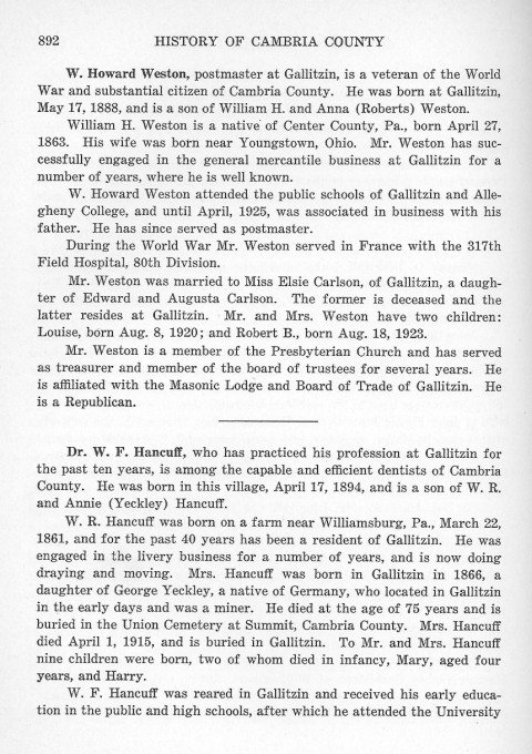 W. Howard Weston, postmaster at Gallitzin, is a veteran of the World War and substantial citizen of Cambria County. He was born at Gallitzin May 17, 1888, and is a son of William H. and Anna (Roberts) Weston. Dr. W. F. Hancuff, who has practice his profession at Gallitzin for the past 10 years, is among the capable and efficient dentists of Cambria County. He was born in this village, April 17, 1894, and is a son of W.R. and Annie (Yeckley) Hancuff. W. R. Hancuff was born on a farm near Williamsburg, Pa., March 22, 1861, and for the past 40 years has been a resident of Gallitzin. He was engaged in the livery business for a number of years, and is now doing draying and moving. Mrs. Hancuff was born in Gallitzin in 1866, a daughter of George Yeckley, a native of Germany, who located in Gallitzin in the early days and was a miner. He died at the age of 75 years and is buried in the Union Cemetery at Summit, Cambria County. Mrs. Hancuff died April 1, 1915, and is buried in Gallitzin. To Mr. and Mrs. Hancuff nine children were born, two of whom died in infancy, Mary, aged four years, and Harry. W. F. Hancuff was reared in Gallitzin and received his early education in the public and high schools, after which he attended the University |