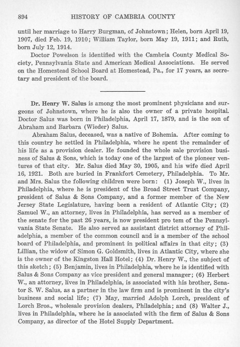 until her marriage to Harry Burgman, of Johnstown; Helen, born April 19, 1907, died Feb. 19, 1910; William Taylor, born May 19, 1911; and Ruth, born July 12, 1914. Dr. Henry W. Salus is among the most prominent physicians and surgeons of Johnstown, where he is also the owner of a private hospital. Doctor Salus was born in Philadelphia, April 17, 1879, and is the son of Abraham and Barbara (Wieder) Salus. Abraham Salus, deceased, was a native of Bohemia. After coming to this country he settled in Philadelphia, where he spent the remainder of his life as a provision dealer. He founded the whole sale provision business of Salus & Sons, which is today one of the largest of the pioneer ventures of that city. Mr. Salus died May 30, 1905, and his wife died April 16, 1921. Both are buried in Frankfort Cemetery, Philadelphia. To Mr. and Mrs. Salus the following children were born: (1) Joseph W., lives in Philadelphia, where he is president of the Broad Street Trust Company, president of Salus & Sons company, and a former member of the New Jersey State Legislature, having been a resident of Atlantic City; (2) Samuel W., an attorney, lives in Philadelphia, has served as a member of the senate for the past 26 years, is now president pro tem of the Pennsylvania State Senate. He also served as assistant district attorney of Philadelphia, a member of the common council and is a member of the school board of Pennsylvania and prominent in political affairs in that city; (3) Lillian, the widow of Simon G. Goldsmith, lives in Atlantic City, where she is the owner of the Kingston Hall Hotel; (4) Dr. Henry W., the subject of this sketch; (5) Benjamin, lives in Philadelphia, where he is identified with Salus & Sons Company as vice president and general manager; (6) Herbert W., an attorney, lives in Philadelphia, is associated with his brother, Senator S.W. Salus, as a partner in the law firm and is prominent in the city's business and social life; (7) May, married Adolph Lorch, president of Lorch Bros., wholesale provision dealers, Philadelphia; and (8) Walter J., lives in Philadelphia, where he is associated with the firm of Salus & Sons Company, as director of the Hotel Supply Department. |