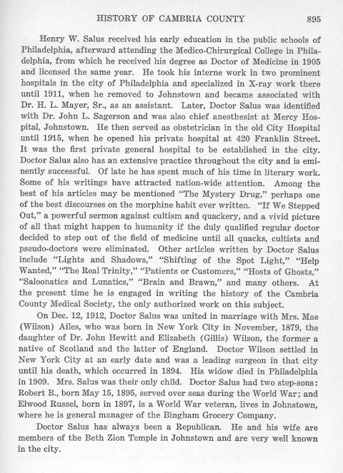 Henry W. Salus received his early education in the public schools of Philadelphia, afterward attending the Medico-Chirurgical College in Philadelphia, from which he received his degree as Doctor of Medicine in 1905 and licensed the same year. He took his interne work in two prominent hospitals in the city of Philadelphia and specialized in X-ray work there until 1911, when he removed to Johnstown and became associated with Dr. H.L. Mayer, Sr., as an assistant. Later, Doctor Salus was identified with Dr. John L. Sagerson and was also chief anesthesist at Mercy Hospital, Johnstown. He then served as chief anesthesist in the old City Hospital, Johnstown. He then served as obstetrician in the old City Hospital until 1915, when he opened his private hospital at 420 Franklin Street. It was the first private general hospital to be established in the city. Doctor Salus also has an extensive practice throughout the city and is eminently successful. Of late he has spent much of his time in literary work. Some of his writings have attracted nation-wide attention. Among the best of his articles may be mentioned "The Mystery Drug," perhaps one of the best discourses on the morphine habit ever written. "If We Stepped Out," a powerful sermon against cultism and quackery, and a vivid picture of all that might happen to humanity if the duly qualified regular doctor decided to step out of the field of medicine until all quacks, cultists and pseudo-doctors were eliminated. Other articles written by Doctor Salus include "Lights and Shadows," "Shifting of the Spot Light," "Help Wanted," "The Real Trinity," "Patients or Customers," "Hosts of Ghosts," "Saloonatics and Lunatics," "Brain and Brawn," and many others. At the present time he is engaged in writing the history of the Cambria County Medical Society, the only authorized work on this subject.